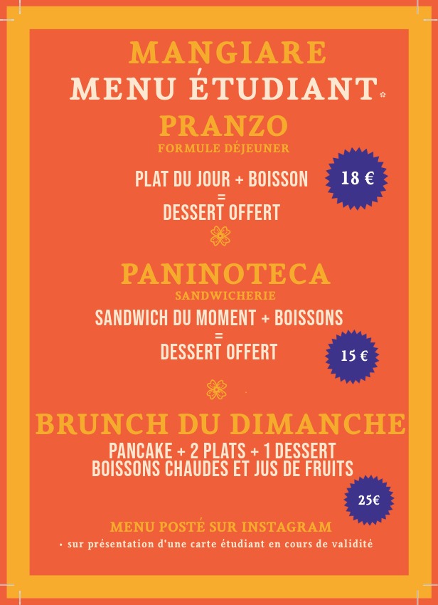 Pour ta pause déjeuner, Mangia Forte te propose un menu étudiant clair et généreux, pensé pour bien manger le midi sans exploser ton budget.